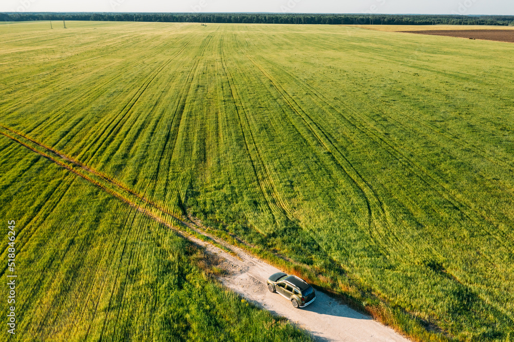 Aerial view of car SUV parked near countryside road in field rural landscape. Bird's-eye drone view of car SUV parked near countryside road in summer field rural landscape.
