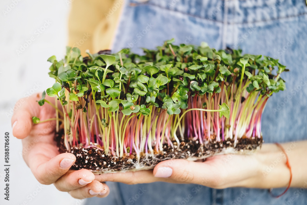 microgreen in Woman hands, Small business indoor vertical farm. Close-up of healthy vegetarian vitamin fresh food. Microgreens growing background with raw sprouts in female hands