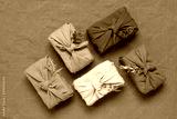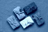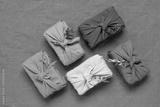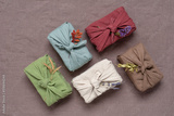 Gifts wrapped in linen fabric with dried flowers. Furoshiki colored gifts. Zero waste concept. Reusable eco-friendly packaging. Brown linen background. Top view, flat lay,