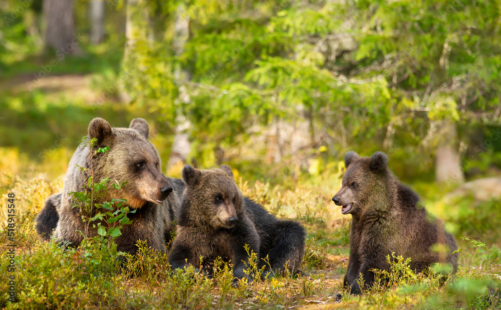 Close up of female Eurasian brown bear and her cubs in boreal forest