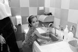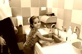 Cute kid going to the bathroom and washing her hands