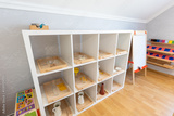 Food trays on a shelf in a montessori kindergarten