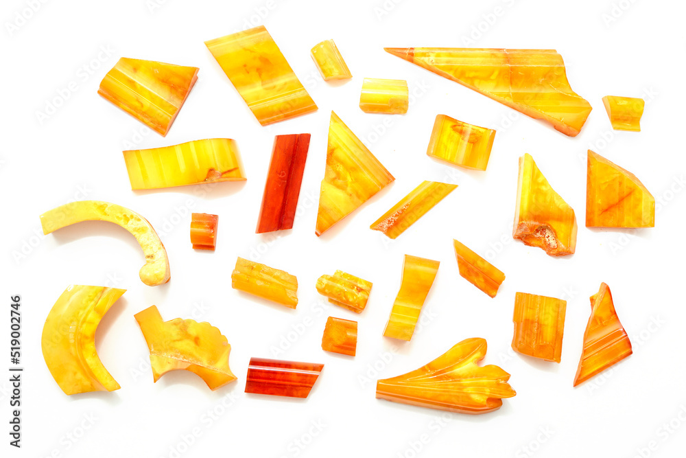 Amber mosaic elements on a white background. Details for assembling a work of art. Jewelry items. Copal. Natural material. semi-precious mineral. Sun stone. Puzzle. Red and yellow crystal