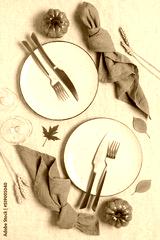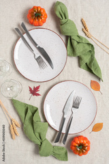Thanksgiving autumn table setting for two persons. Crockery, cutlery and decorative pumpkin on beige linen tablecloth. Top view, flat lay. Selective focus.
