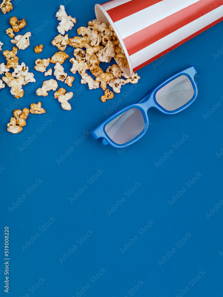 Popcorn spilled from a white and red striped bucket near 3D glasses on a blue background. Cinema, movies, movie night and entertainment concept. Top view, above, overhead. Space for text.