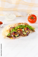 Döner Kebab Doner Kebap fast food in flatbread on a wooden board portrait format