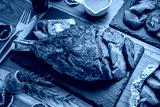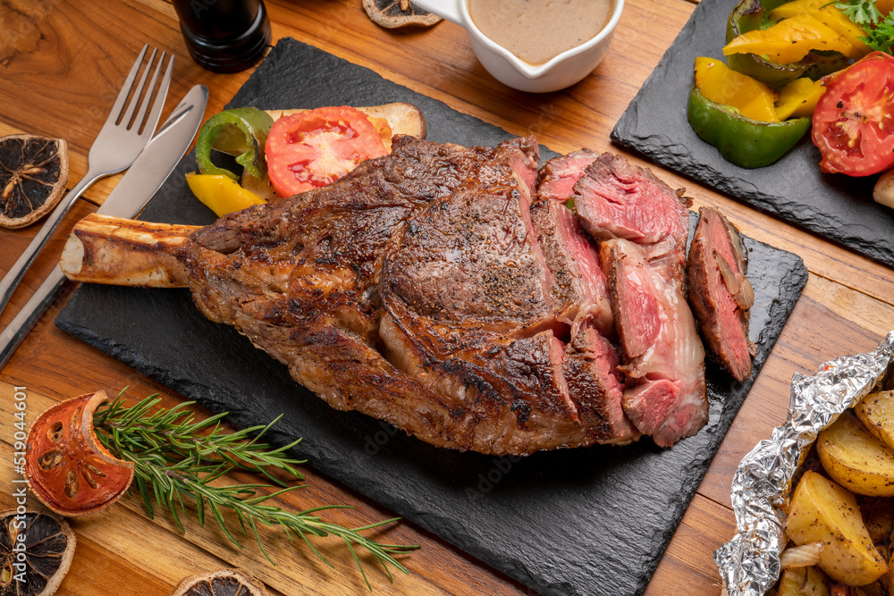 Grilled tomahawk ribeye steak in black stone plate on wooden table, Barbecue Tomahawk Steak on Cutting black stone plate.