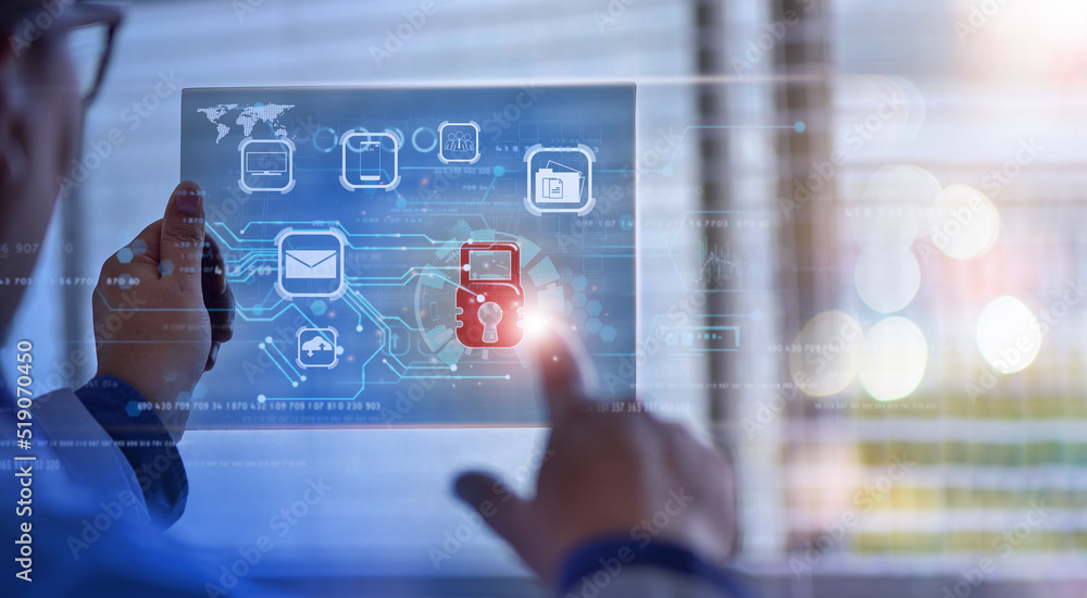 Business, technology, internet and networking concept. Young business working on the virtual display.
