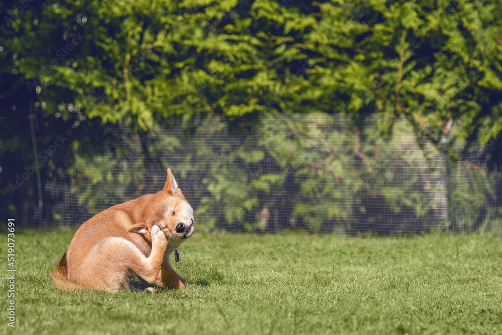 Shiba inu puppy is sitting on the grass on sunny summer day and scratching his face