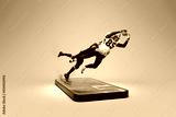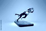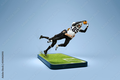 Creative collage with male american football players in action on 3d phone screen over gray background. Sport, challenges, social media, online sports games
