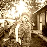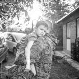 Little boy and soldier in a military uniform say goodbye before a separation. Back view of young father holding and embracing his son.