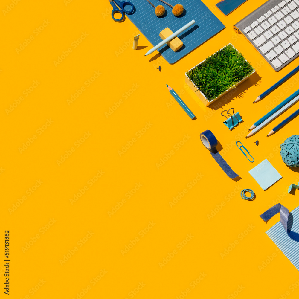 Orange color mock up young student desk, with blue supples, notebook, accessories and copy space.