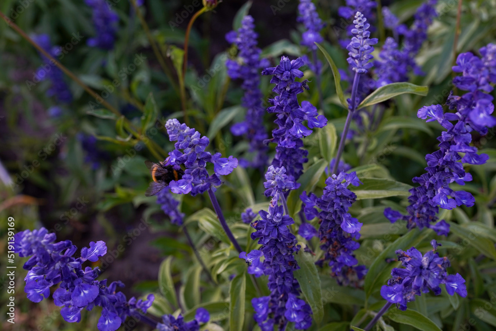 Blooming blue flowers pollinated by bee in a field at sunset. Close up. summer background with beautiful purple colors