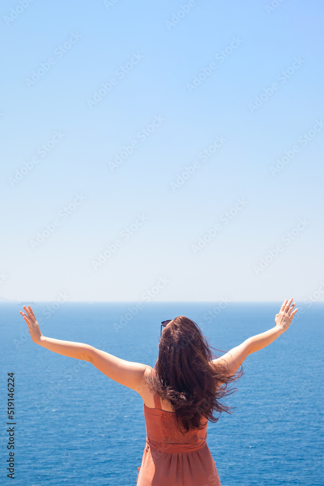 Beautiful girl in a summer dress enjoying a vacation at the sea