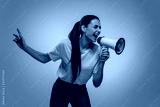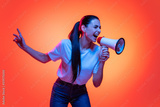 Portrait of young emotional girl, student in white t-shirt isolated on orange color background in neon light. Concept of beauty, fashion, emotions
