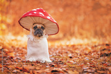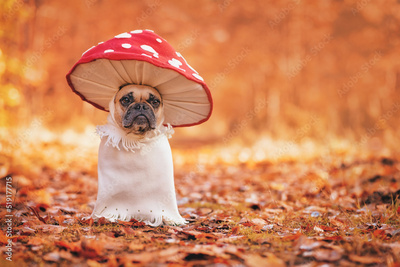 Funny French Bulldog dog in unique fly agaric mushroom costume standing in orange autumn forest with copy space