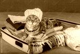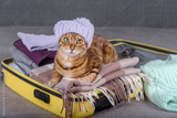 A cat in a hat in a suitcase with warm clothes.