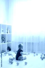 baby 7-9 months to a year old sits on the floor in a cozy white interior nursery with stylish furniture