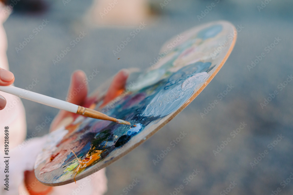 Beautiful female artist's hands with a palette of paints and a brush