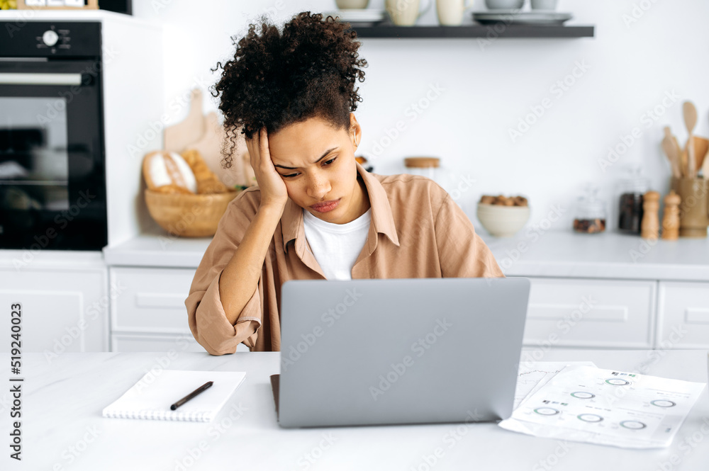 Overworked exhausted young african american woman, freelancer or student, working remotely from home, tired of boring online work, suffering from chronic fatigue, overwork, falls asleep at the desk