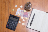 Egyptian Money, Plastic New Ten Egyptian Pound, Paper Banknotes and Coins on Wooden Desk, Calculator, Notebook and Pen, Closeup Top View, Space for Text