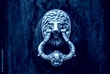 Vintage antique bronze gilt round lion head door handle on a front door, gate. Entrance to a residential building, castle. Detail of exterior, architecture. Door knocker on a wooden brown background.