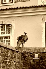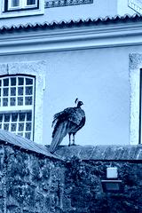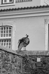 Bright peacock on the house wall in the old area of Lisbon, Portugal