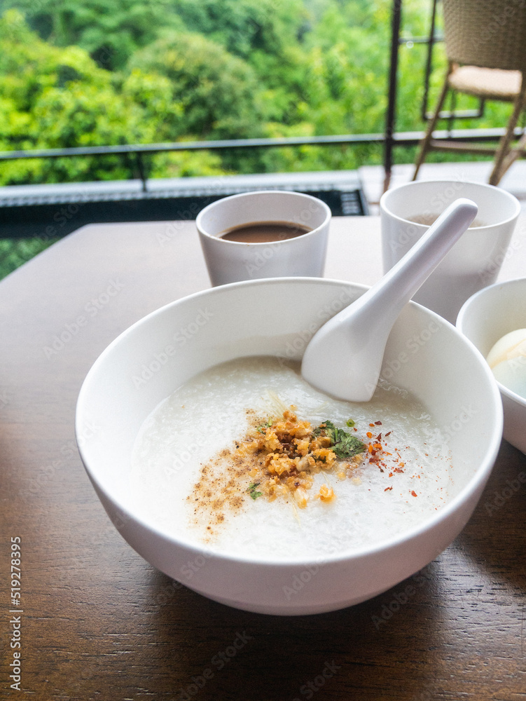 Minced Pork Congee with Soft Boiled Egg in bowl on wood table.