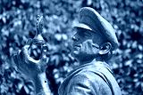 a monument to the literary hero Ostap Bender with a onem chess piece in his hand on a green background. Monument in Elista Kalmykia Russia