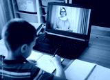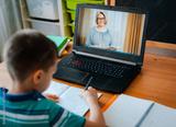 Distance learning online education. A schoolboy boy studies at home and does school homework. A home distance learning