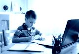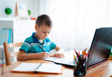 Distance learning online education. A schoolboy boy studies at home and does school homework. A home distance learning