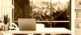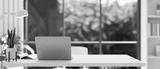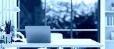 Modern stylish workspace with laptop and copy space on the table over blurred office background.