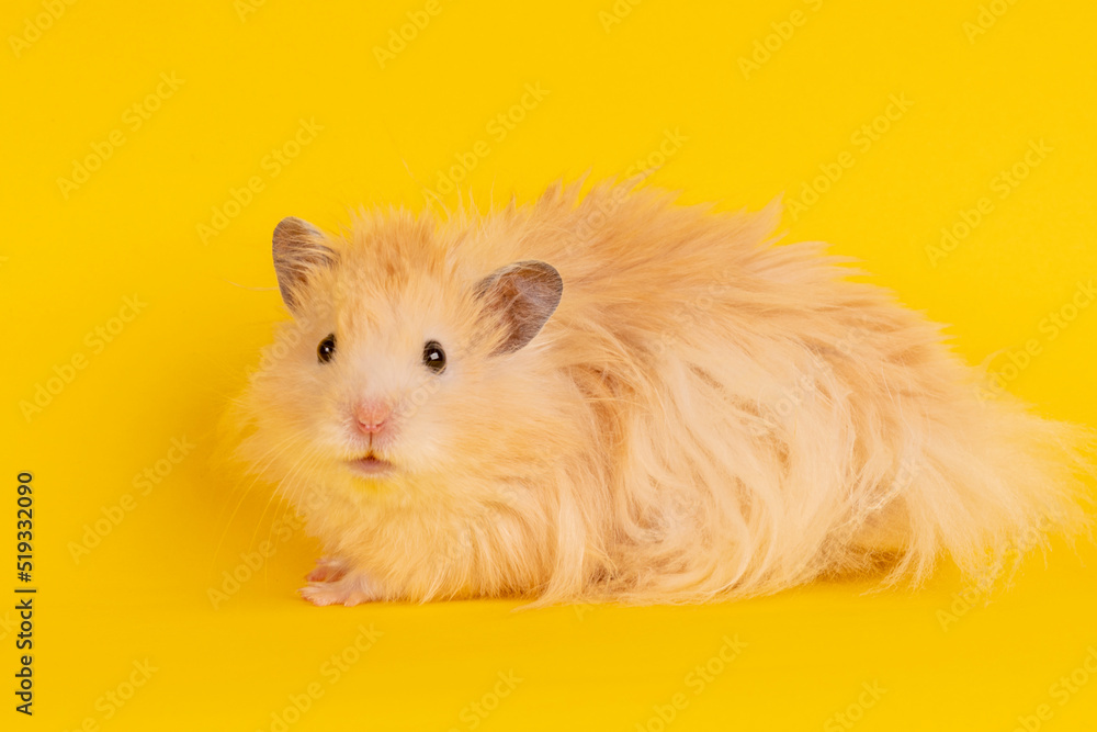 fluffy angora hamster on a yellow background