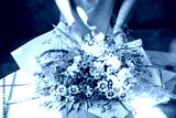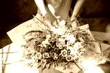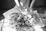 A woman florist packs a multi-branch bouquet in white paper on the table in her flower studio. Only the bouquet in the frame