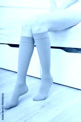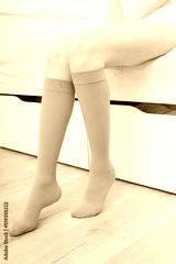 Beige compression stockings on a woman in a white room. Knee socks or socks. Girl putting on stockings at home. Beautiful female legs.