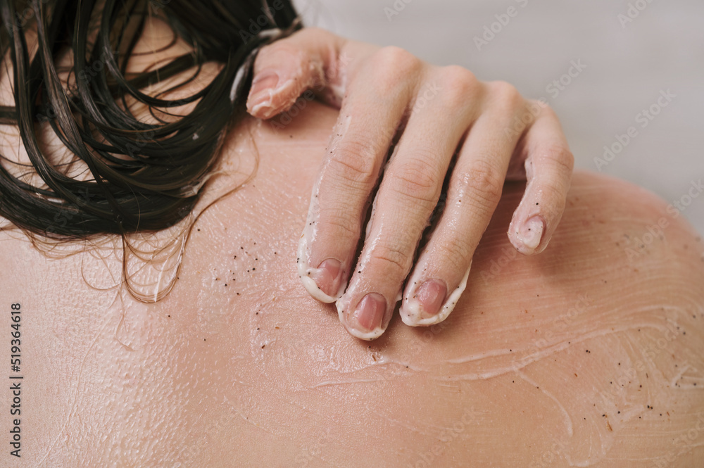 Faceless shot of woman using narutal scrub on her shoulder in the shower