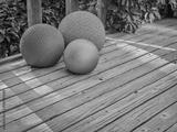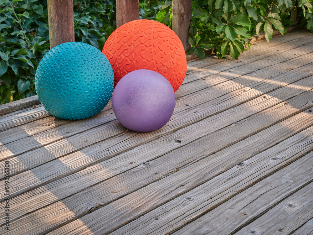 three heavy slam balls filled with sand on a backyard deck with morning light, exercise and functional fitness concept