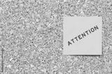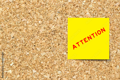 Yellow note paper with word attention on cork board background with copy space