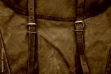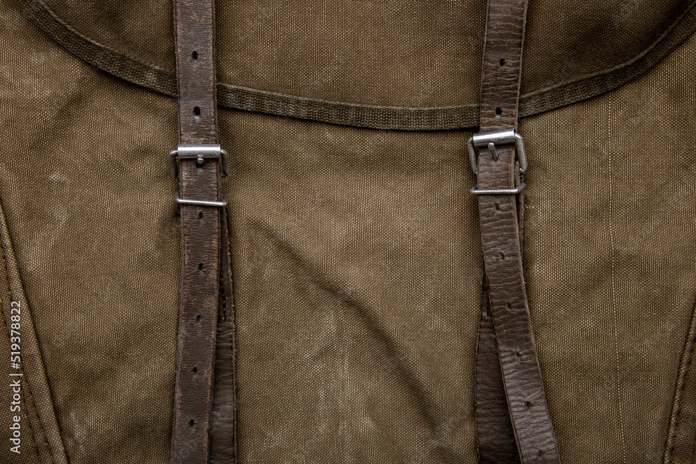 Close-up texture of a canvas fabric backpack. Leather straps and metal buckles. Vintage khaki back.