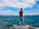 A young guy stands against the backdrop of the Bosphorus in Istanbul