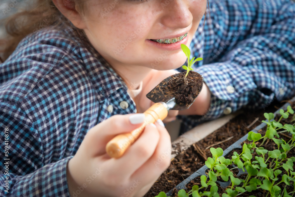 Happy teenager holding plant seedlings at fall day in organic farm. Harvesting on the farm.