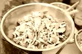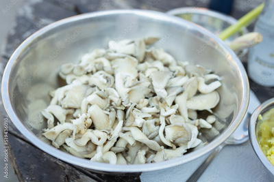 a large plate of white fresh mushrooms for cooking in the summer kitchen