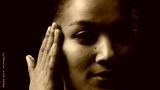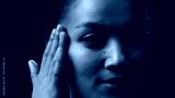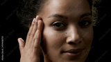 Good-looking African American young woman with black curly hair touches her temple looking at the camera on black background | Face skin care concept