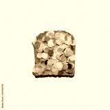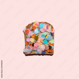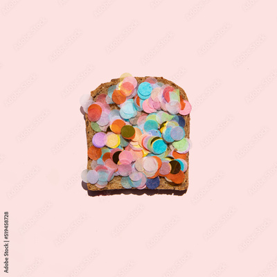 Creative composition with bread slice and confetti on light pink background. Trendy tasty food concept. Modern party flat lay.