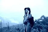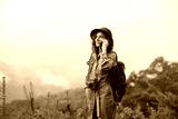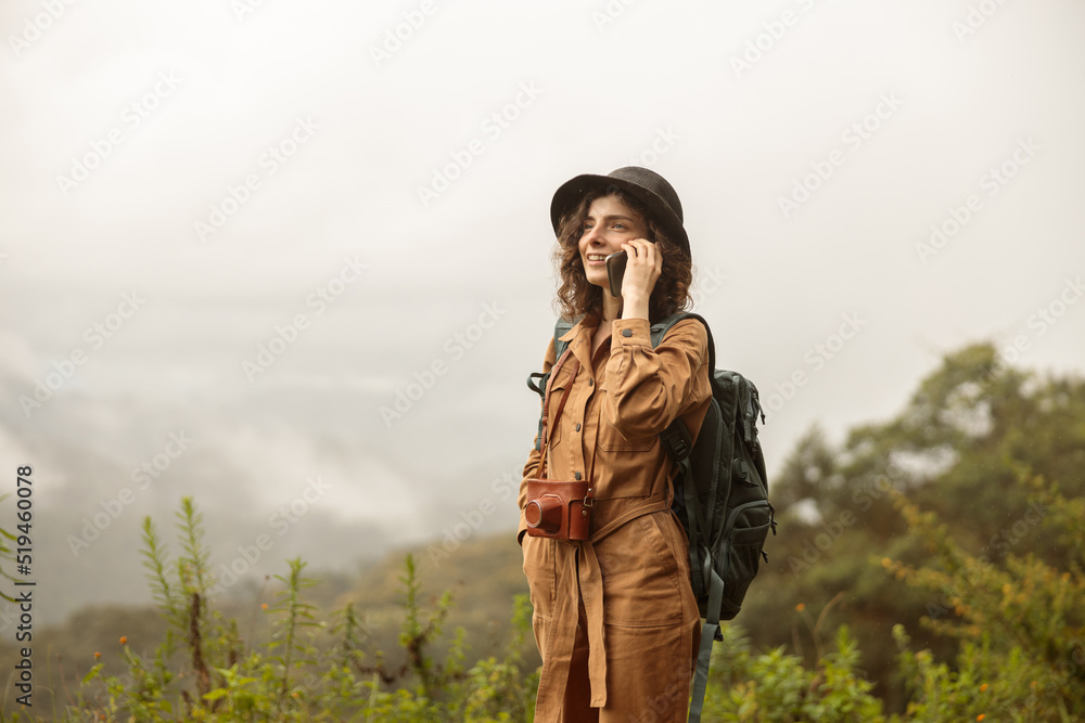 Smiling young woman in hat with backpack talking on mobile phone, copy space