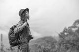 Side view of happy lady in hat standing and looking to the beautiful nature of the mountains in Africa, copy space