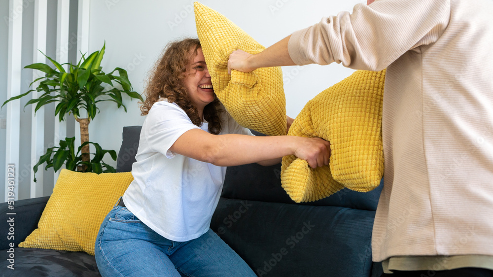 Boyfriends having fun playing together on sofa at home fighting with cushion
