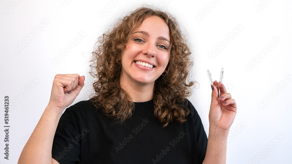 Happy woman with white smile, healthy straight teeth using clear removable brace