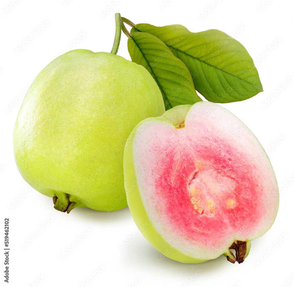 Pink guava fruit with leaf isolated on white background, Fresh Pink guava on White With clipping path.