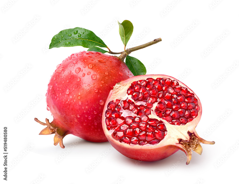 Fresh Pomegranate fruit with water droplets and cut in half isolated on white background. Clipping path.